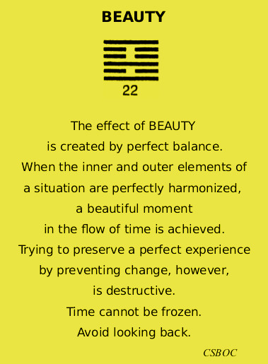 The bottom line warns, “Only unselfish motives and moderate actions will meet with success.” It changes to BALANCE, the original hexagram of yesterday’s equinox reading. Given that today, the 22nd of September, is the actual equinox date, I’m smiling at this bit of synchronicity. The repeater confirms yesterday’s message. : )