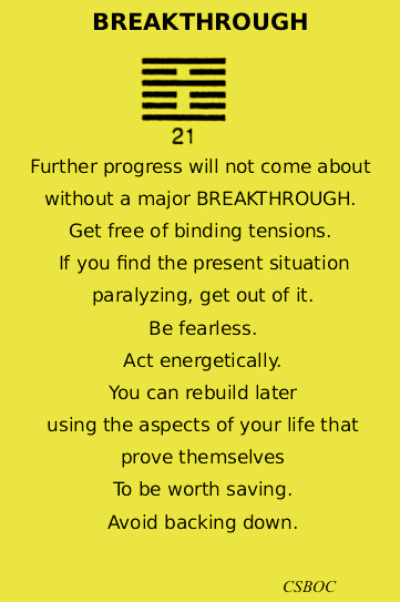 The answer came back, unequivocal. No changing lines. Hexagram 21, BREAKTHROUGH. It looks like this: