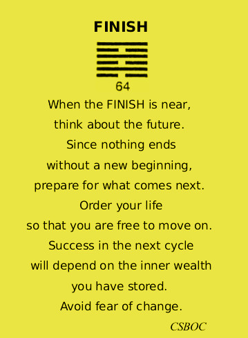 So in this case, Hexagram 64, FINISH, signifies the end of a cycle. It’s not extinction, but rather an upgrade.