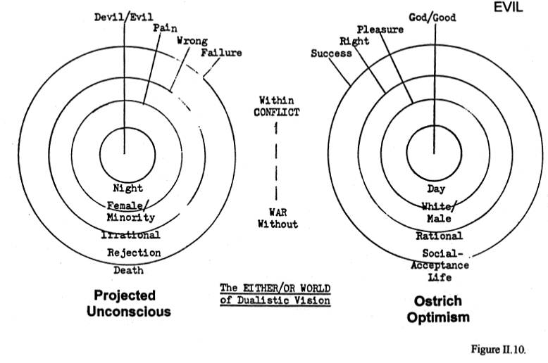 To recap from earlier discussions. satanism thrives on the conflict mentality fostered by an either/or dualistic world view. Divine masculine and divine feminine, rather than being accepted as mutually interdependent aspects of a larger whole, are set in opposition, as if mutually exclusive and inherently antithetical.