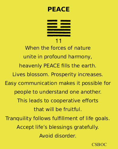 Here, the lower three straight lines form the trigram representing “Heaven.” The upper three broken lines form the trigram called “Earth.” When heavenly energy fills the earth plane and earthly energy ascends, their mystical interaction results in Peace above and below. Heaven below supports earth above, and all is well.