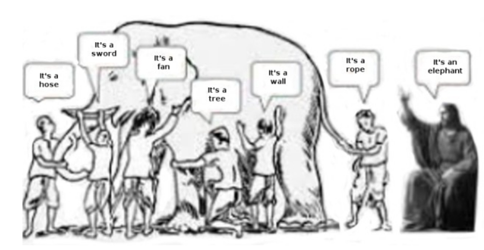 The one who embraced a leg said elephants are round and rough, like the trunk of a tree. The next, who felt a tusk, said elephants are hard and sharp, like a sword. The one who felt an ear described elephants as thin, flat and flexible. The last, who grabbed hold of the tail, was certain elephants are like ropes, perhaps even whips.