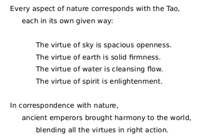 Working with nature as an aid, rather than an obstacle to enlightenment, is a Taoist keystone. As Lao Tze puts it in Passage 6: