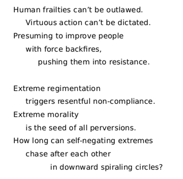 Lao Tze, however, is skeptical about attempts to change others, especially through coercive measures that fail to respect free will or to regard human aspirations with understanding compassion. Thus, in Passage 57 he observes:
