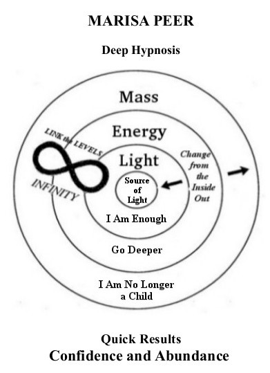 “According to Marisa, the subconscious mind doesn’t tolerate conflict. That’s why we can’t get results by chanting positive affirmations when they go against the grain of childhood programming. So the first job is to clear out counter-productive, unconscious programming installed in the middle e=energy level that no longer serves. Only then we can safely proceed to install positive new beliefs and get consistent results.